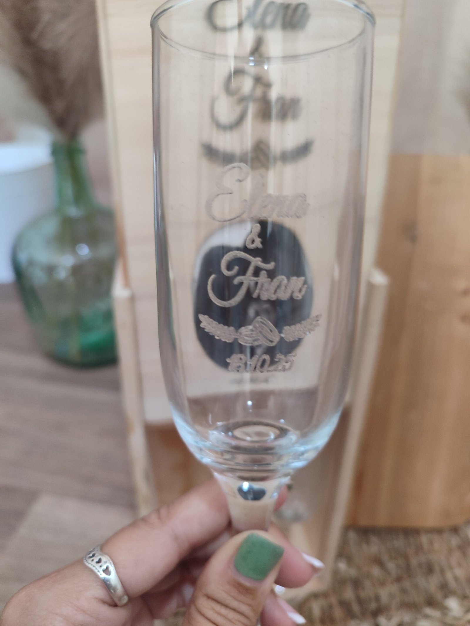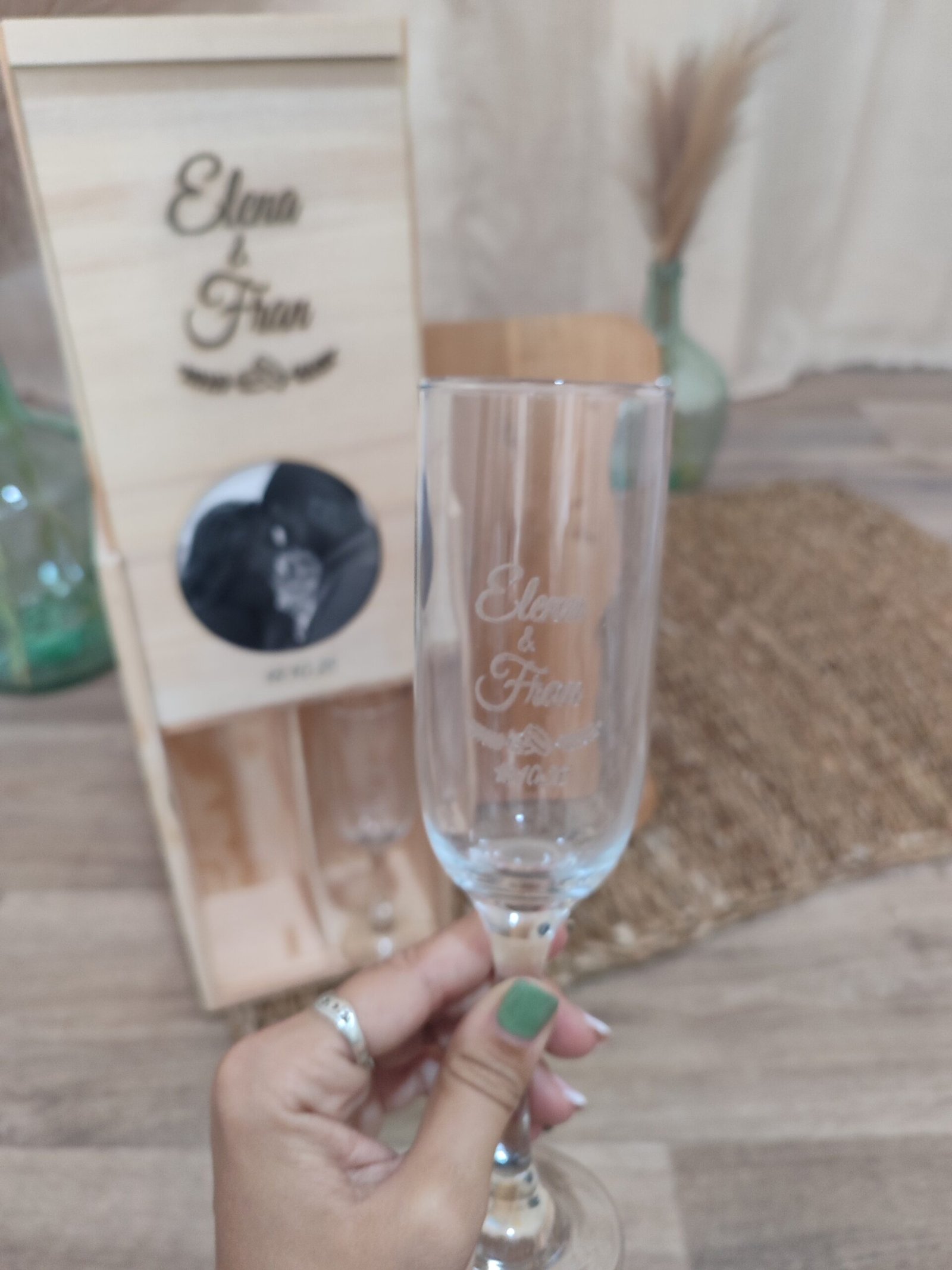 Caja de madera con foto y copas grabadas