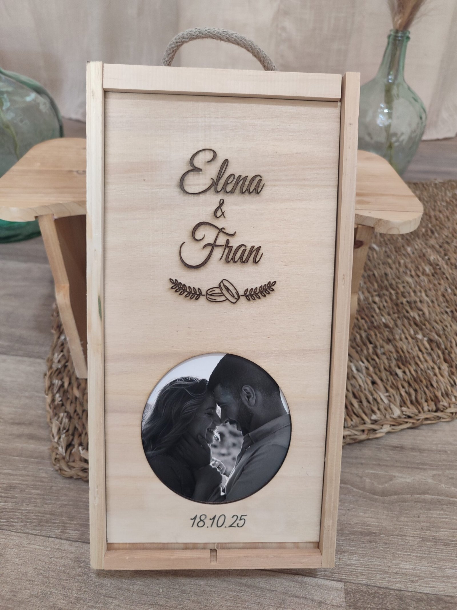 Caja de madera con foto y copas grabadas. Estas cajas personalizadas son una opción perfecta para guardar recuerdos especiales. Puedes incluir una foto que capture un momento inolvidable, ya sea una boda, un cumpleaños o una celebración importante. Las copas grabadas añaden un toque de elegancia y personalización que las convierte en un regalo ideal para cualquier ocasión. Imagina regalar una caja así a tus amigos o seres queridos, llena de memorias y con un diseño único que resalte su importancia. Además, hay diferentes tipos de madera que se pueden utilizar para hacer estas cajas, lo que permite que cada pieza sea única y especial. La madera puede ser tratada para que resista el paso del tiempo y mantenga su belleza. Las copas grabadas pueden tener un mensaje especial, una fecha importante o incluso un diseño que represente algo significativo para la persona que lo recibe. Con cada uso, recordarán el momento especial que se celebró. Estas cajas son perfectas para guardar cosas como joyas, cartas, fotografías o cualquier otro objeto que desees conservar. Si deseas hacer un regalo realmente especial, considera incluir dentro de la caja un álbum de fotos o una carta escrita a mano, lo que le dará un valor sentimental aún mayor. En conclusión, una caja de madera con foto y copas grabadas no solo es un objeto decorativo, sino un verdadero tesoro lleno de recuerdos. Al elegir una de estas cajas, estás eligiendo un regalo que hablará de tu atención al detalle y de tu deseo de compartir momentos especiales con los demás.
